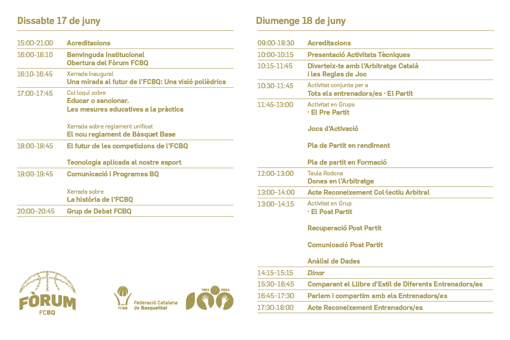 La Federació Catalana de Basquetbol ha anunciado la celebración del ForumBQ, un espacio de debate e interacción, que tendrá lugar el próximo fin de semana, los días 17 y 18 de junio, en el INEFC Barcelona. El evento se enmarca dentro de los actos del centenario de la Federació y está abierto a todos los colectivos que conforman el basket catalán. Contará con ponencias, charlas y mesas redondas para debatir sobre el presente y futuro del deporte de la canasta.