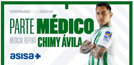 El parte médico de los servicios médicos del Real Betis indica lo siguiente: “Tras las valoraciones y pruebas realizadas por los servicios médicos del Club a nuestro jugador Chimy Ávila, se confirma que presenta una lesión miotendinosa proximal de isquiotibial izquierda. El tiempo de su regreso a los terrenos de juego está pendiente de evolución”.