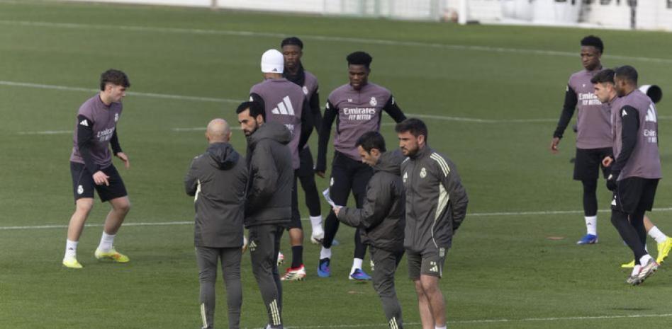 Arbeloa se mostró muy serio en todo momento viendo las carreras de calentamiento de sus jugadores y los rondos iniciales. Entre esos jugadores no estuvo Mbappé, que se recupera de su rodilla. Tampoco estuvieron Rodrygo, Rüdiger, Mendy, Trent y Militao.
