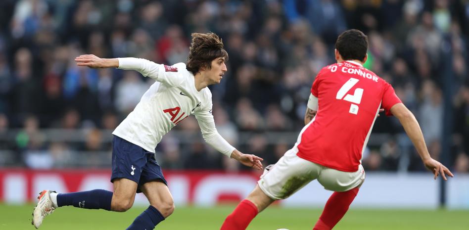 LONDON, ENGLAND - JANUARY 09: Bryan Gil of Tottenham Hotspur is closed down by Anthony O'Connor of Morecambe during the Emirates FA Cup Third Round match between Tottenham Hotspur and Morecambe at Tottenham Hotspur Stadium on January 09, 2022 in London, England. (Photo by Julian Finney/Getty Images)