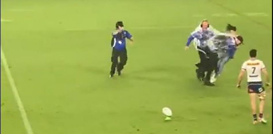 Una de las espectadoras saltó al césped en ropa interior y recorrió gran parte del campo mientras era perseguida por los agentes de seguridad. Pero la polémica llegó con la manera que tuvieron de pararla: un placaje digno del partido que se estaba viendo.